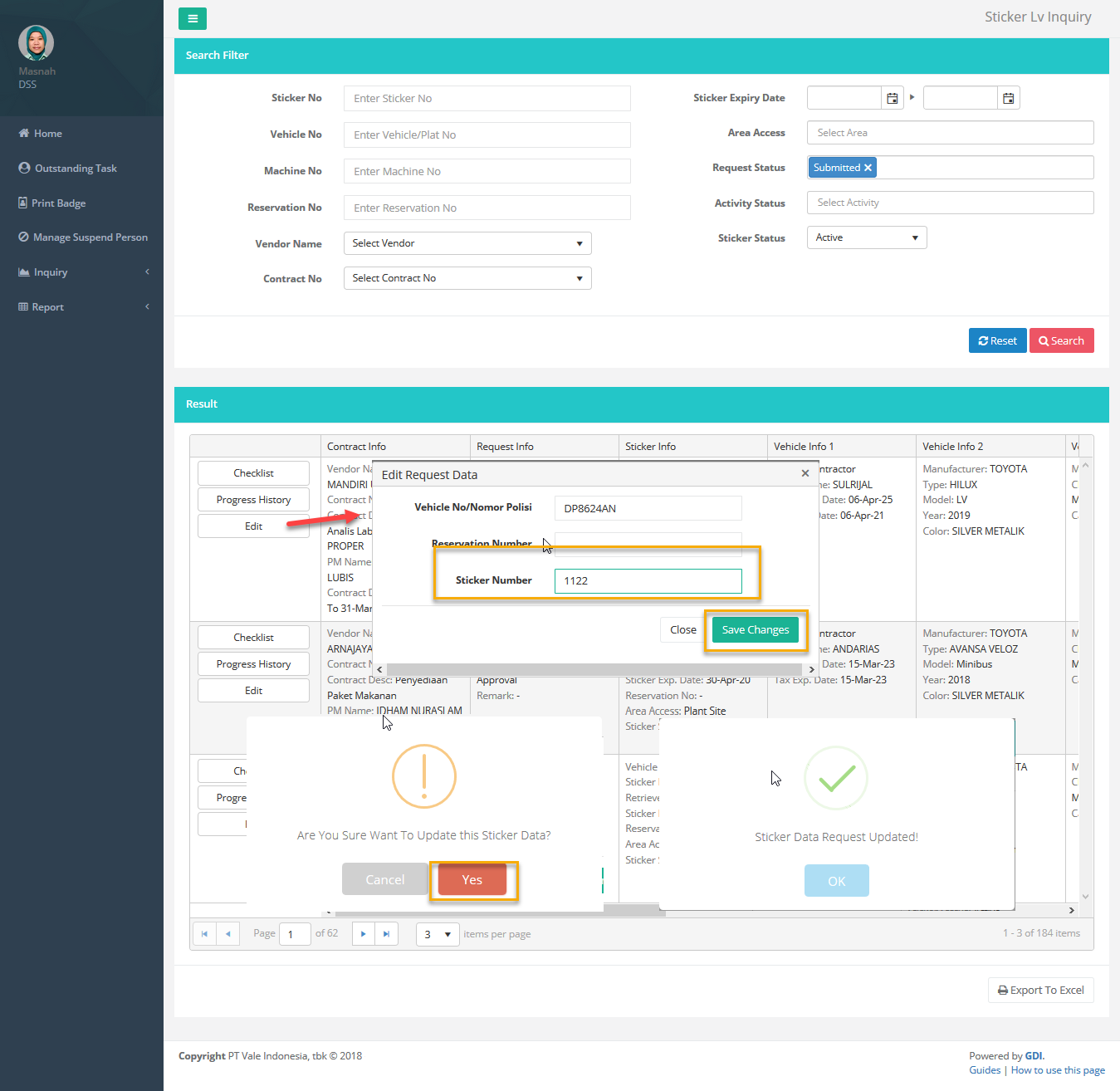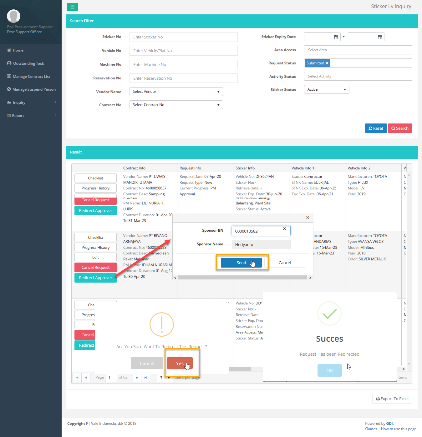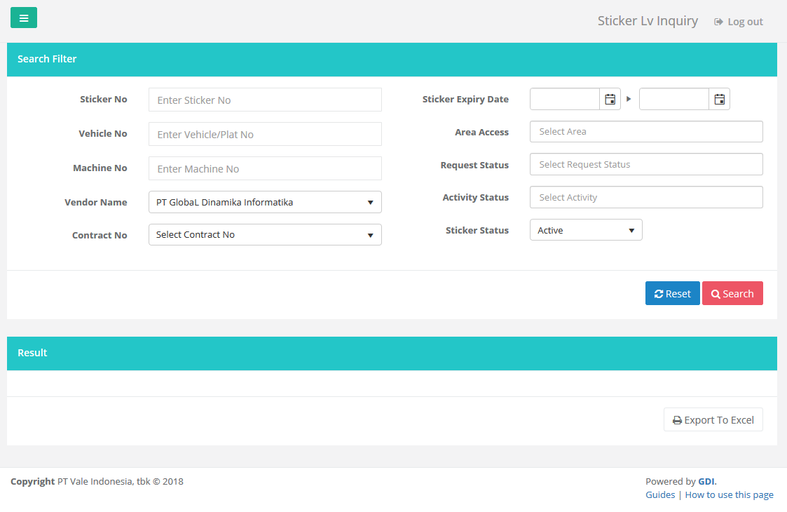 Halaman ini dapat digunakan Kontraktor untuk mencari semua data Sticker LV yang sudah di-request. Untuk video penggunaan fitur ini dapat diklik link berikut : Sticker LV - Inquiry