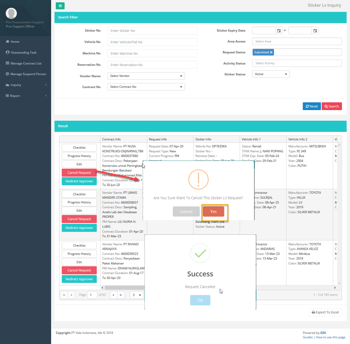 Halaman ini dapat digunakan Procurement Suppport untuk melakukan cancel request sticker LV